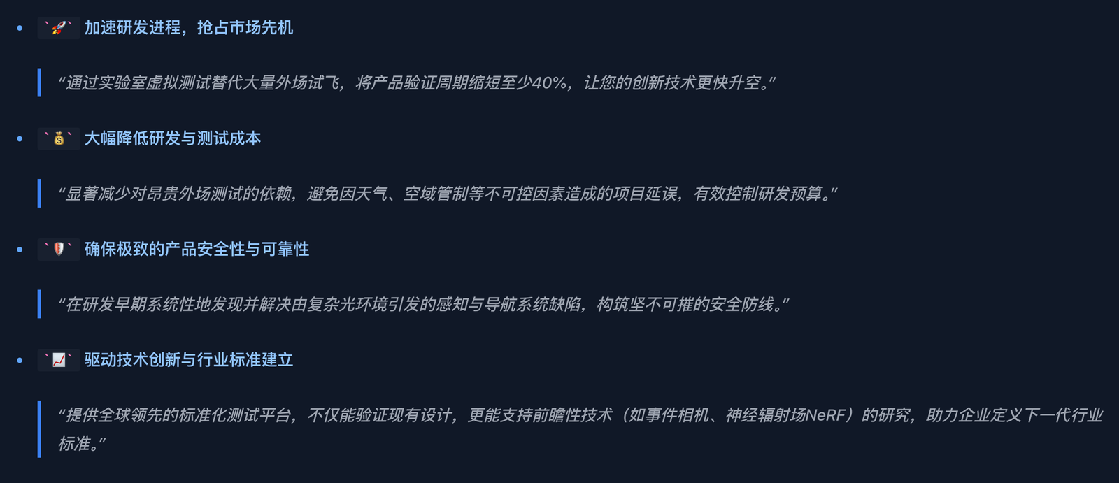 面对低空飞行器行业的诸多挑战,秀白科技推出基于“X-Mation 光学仿真引擎”的整体解决方案。我们并非简单提供测试设备,而是打造了一个集“全天候环境模拟 – 硬件在环测试 – 数据闭环优化”于一体的综合性研发与验证平台。该平台依托我们自主可控的全谱域智能光变调控技术与高动态天空光模拟算法,帮助客户在实验室内构建超高保真的虚拟飞行测试场,以前所未有的效率和精度,驱动低空飞行器的技术创新。